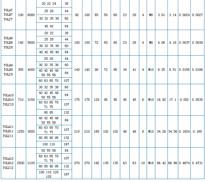 | 注:1、瞬時過載轉矩不得大于公稱轉矩的2倍。 2、質量和轉動慣量是各型號中特大值的近似計算值。 3、B1是保證原動機或工作機安裝所必需的特小尺寸。 4、建議TGL10~TGL12采用B型。 TGL聯軸器許用補償量 |