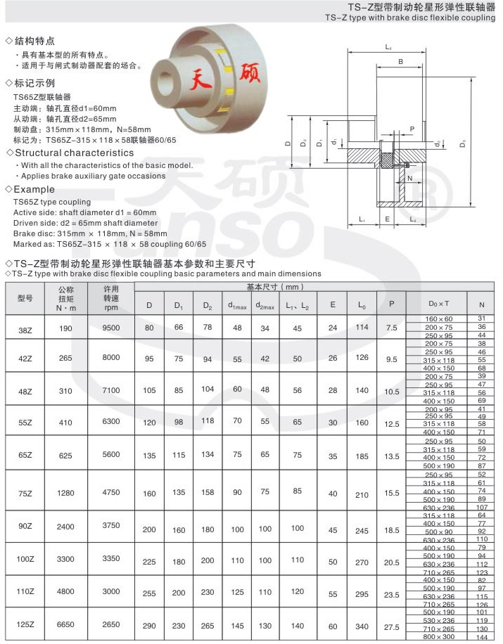 星形彈性聯軸器是利用星形彈性元件置于兩半聯軸器凸爪之間以實現現半聯軸器的彈性聯接,結構特點尺寸緊湊慣性小,以工程塑料作彈性元件,適用于聯接兩同軸線的傳動軸系,具有補償兩軸相對偏移、緩沖、減震、耐磨性能,不用潤滑,可以在有粉塵和水份的條件下工作,結構簡單,維修方便,但更換彈性元件時需移動一端半聯軸器和主機軸。適應場合普遍,傳遞轉矩20-35000.N.M,工作溫度-35-+80攝氏度并與德國ROTEX聯軸器互換。聚氨脂彈性體由凸形爪塊限制,可避免由于沖擊產生的內部變形及離心力產生的外部變形;凸爪大的凹面,使漸開線齒上的表面壓力很小,齒上即使承受過載,齒仍不會磨損或變形。具有補償兩軸相對偏移、減振、緩沖、徑向尺寸小、承載能力較高、維護方便等特點,但更換彈性元件時兩半聯軸器需沿軸向移動。適用于聯接兩同軸線、起動頻繁、正反轉變化、中低速、中小功率傳動軸系、要求工作可靠性高的工作部位,不適用于重載及軸向尺寸受限制、更換彈性元件后兩軸線對中困難的部位。